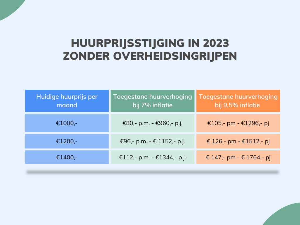 Bij een inflatie van slechts 7% mogen de huren volgens de huidige regels volgend jaar met 8% stijgen. Voor een huurder die op dit moment 1000 euro per maand betaalt, betekent dit een huurverhoging van 80 euro per maand ofwel 960 euro extra per jaar. Bij een minder gunstige inflatieverwachting van 9,5% gaat deze huurder per maand 105 euro extra betalen, een bedrag van 1260 per jaar.
